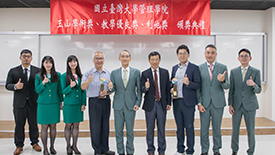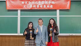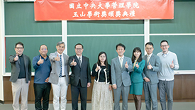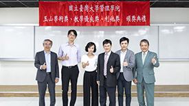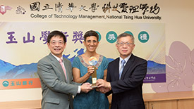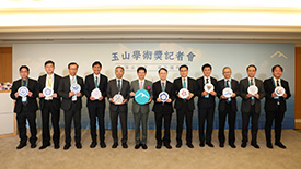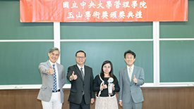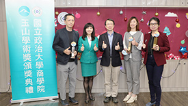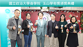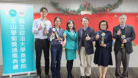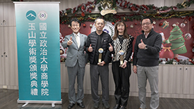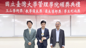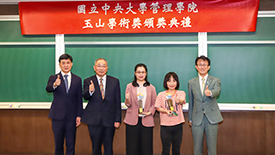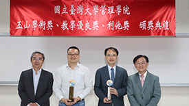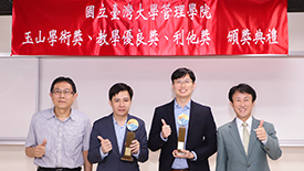 「玉山學術獎」頒獎典禮,由臺大管理學院院長陳家麟、玉山金控財務長程國榮共同頒獎,獲獎教授為財金系曾郁仁老師、曾俊凱老師、洪志清老師,以及資管系黃明蕙老師,研究成果發表在《Management Science》、《The Accounting review》、《Journal of Consumer Research》國際頂尖期刊。