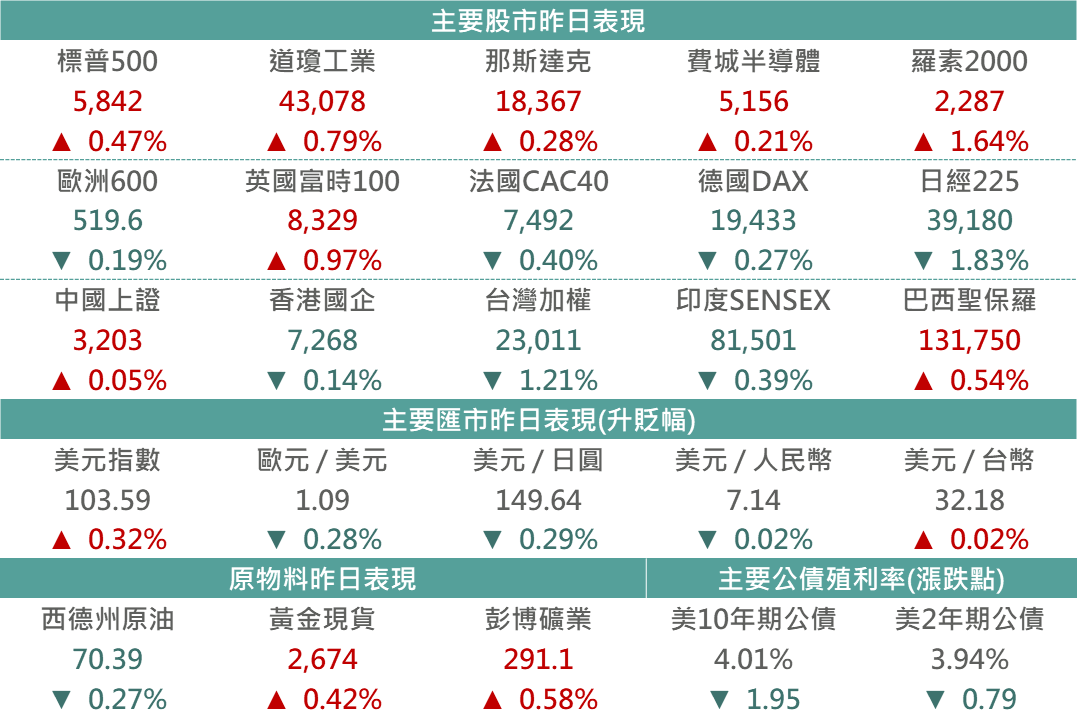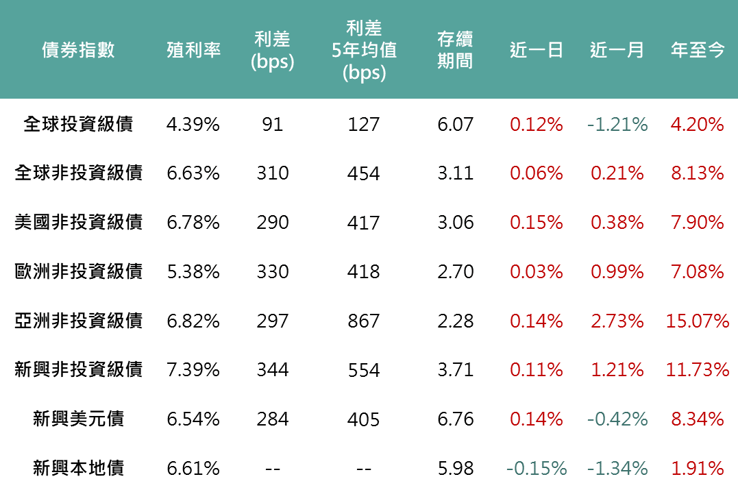 昨日美國公布9月進口物價指數,相較上個月下滑0.4%,為2023年12月以來最大降幅,而進口價格回落主要是由能源產品價格下降所致,疊加昨日油價持續走弱,緩解市場對通膨擔憂,促美債殖利率下滑,推動各債種上揚,全球投等債上漲0.12%、全球非投等債上漲0.06%、新興美元債上漲0.14%,新興本地債方面,由於原物料疲弱,以及美國總統大選鄰近,拉美貨幣逐漸遭遇壓力,拖累新興本地債表現,使本地債下跌0.15%。