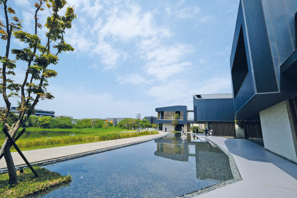 為綠意所環繞,池塘碧水倒映出一座一座簡潔的黝黑清水模建築群,致敬硯與墨的橫山書法藝術館靜靜地矗立著,靜靜地流洩著藝術能量。
