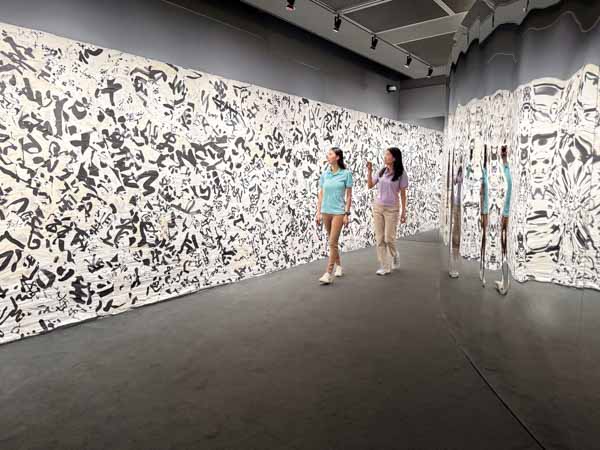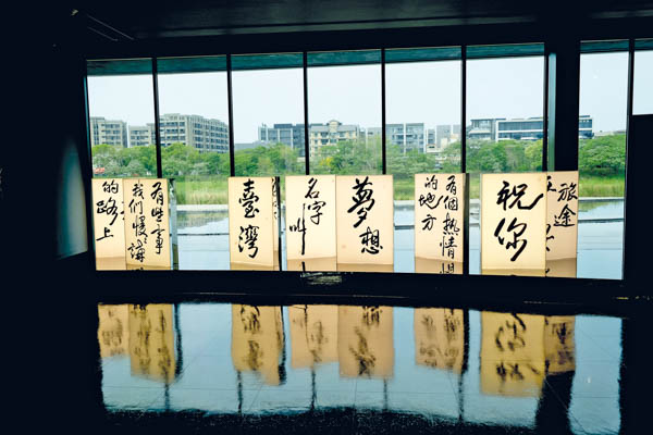 例如「當下.朱振南書藝展」,便邀請到朱振南大師親臨現場。入口《機場之歌》是所有旅客於第一航廈出境時,深感震撼的豪邁行草書筆墨,透過「臺灣、夢醒、在旅途」等原作筆墨與鏡面展台形成的雙倒影,營造出作品漂浮的魔幻氛圍。「吉光.片羽」展區則是大師親自在現場創作,以手撕千張未公開的宣紙,並堆疊黏貼在幽暗的弧形鏡面空間裡,予人仿似被書法包圍卻又領略到浩瀚無限的虛實感,迴旋的盡頭是大師書寫《道德經》的真跡,能細細反思蘊含於筆畫的禪韻意味。各項展覽雖有期限,但傳遞書法藝術性的意義卻無窮,館方即是希望藉由不同的藝術策展,呈現書法超越傳統的含義,以及對書藝的重新詮釋。