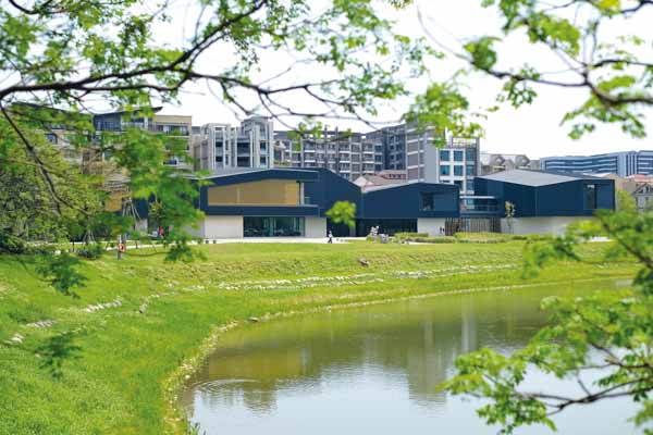 從公園往建築群望去,能感受到建築師希望營造的硯與墨情境。
